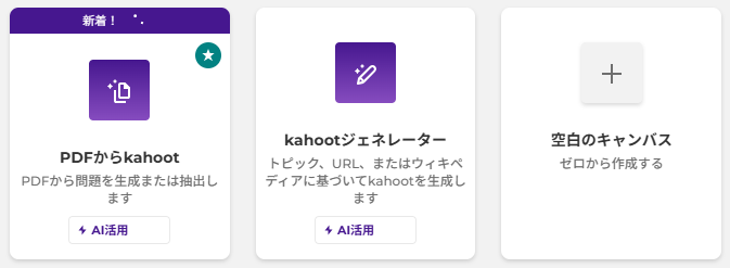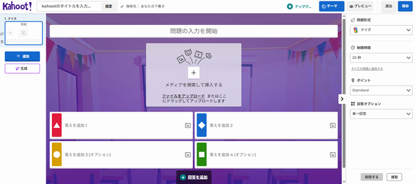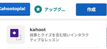 画面右上の青いボタン「作成」→「Kahoot」を押すと、クイズ作成画面が開きます。