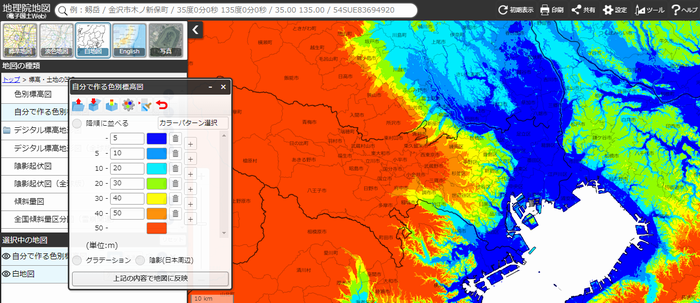 色をつける標高のレベルを自分で設定することが出来るため、学校の周辺など身近なエリアの標高図を作成することもできます。2m刻み、5m刻みなどでも作成することができるので、小さな起伏も地図で確認することができます。
