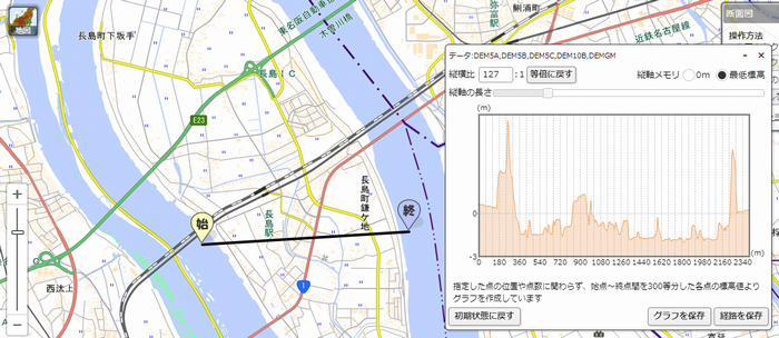 【表示手順】右上メニュー(ツール)→断面図→(地図上で2点をクリック)