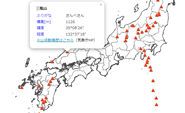 活火山がどこにあるかを地図上で知ることができます。