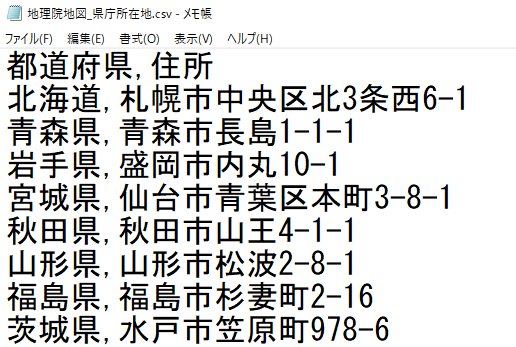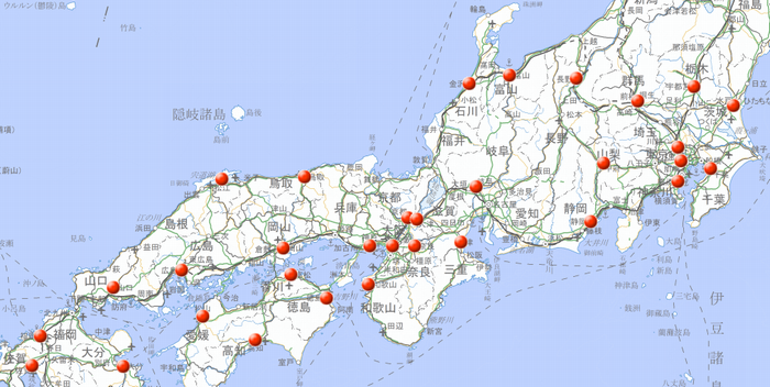 上の例では都道府県庁所在地(県庁がある住所)にマークをつけています。