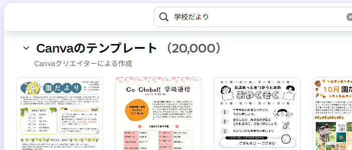 「テンプレート」の検索がCanva活用のカギです。「通知表カバー」「自己紹介カード」「表彰状」など具体的なキーワードで検索してみて下さい。