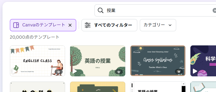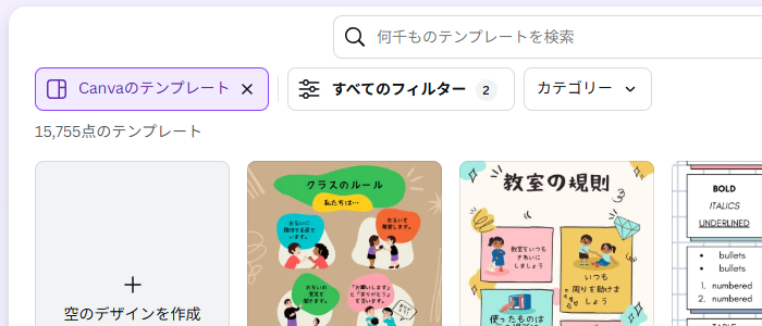 ホーム画面からテンプレートを検索するときは、フィルター(キーワードを入力するエリアの下にあります)をクリックして、「テーマ」の「教育」「学校」にチェックを入れると、学校で使うものが見つかりやすくなります。
