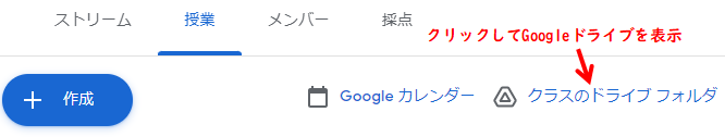 クラスのドライブフォルダに動画を保存している場合は、クラスルーム「授業」ページにある「クラスのドライブフォルダ」をクリックすると表示されます。