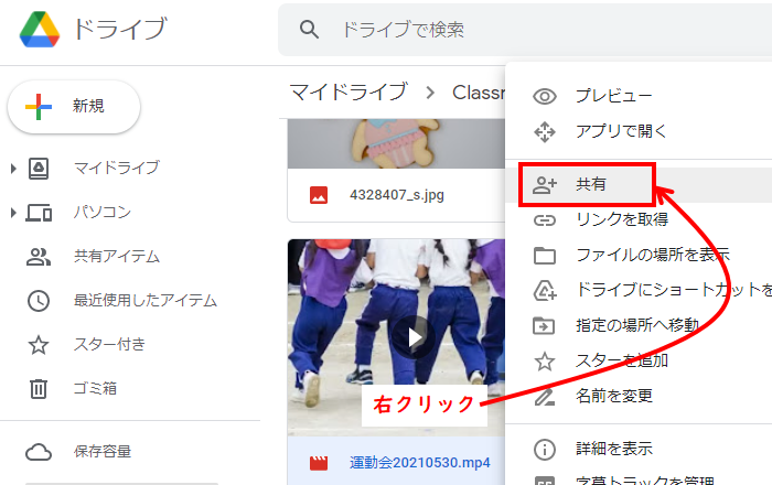 対象とする動画のところで右クリックし、表示されたメニューから「共有」を選択します。