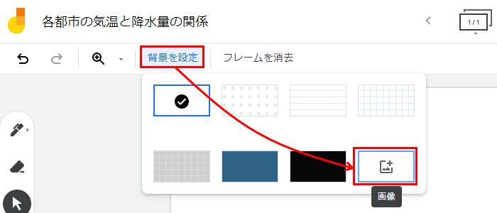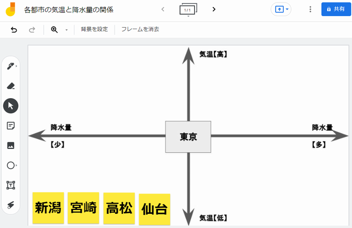 ジャムボードに背景として設定する部分(上の例では「東京」や座標軸など)は、Googleスライドで作成→画像としてダウンロード→ジャムボードの背景に画像を設定します。