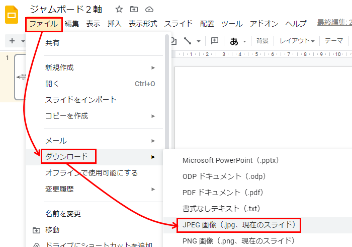 背景となる部分のスライド作成後に、(メニュー)ファイル→ダウンロード→JPEG画像を選択。