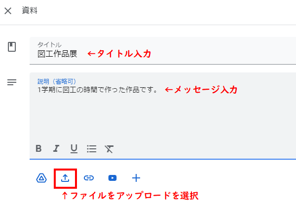 タイトル、メッセージを入力し、画面下のボタン「ファイルをアップロード」をクリック。