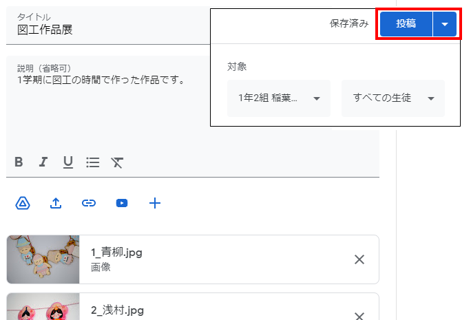 ファイル名がクラスルームに表示される(上の例では「1_青柳.jpg、2_浅村.jpg」など)ので、見たときにわかりやすいファイル名にしておくことをオススメします。