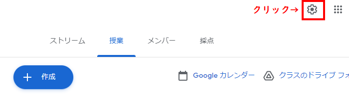 教師アカウントでクラスルームを表示し、右上の歯車ボタンをクリック。