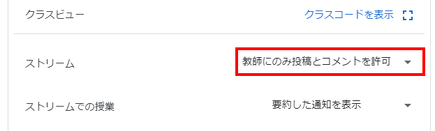 表示された設定画面にある「ストリーム」の項目を「教師にのみ投稿とコメントを許可」に変更します(▼をクリックすると選べるようになります)。