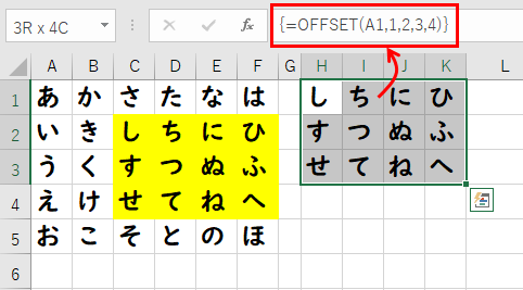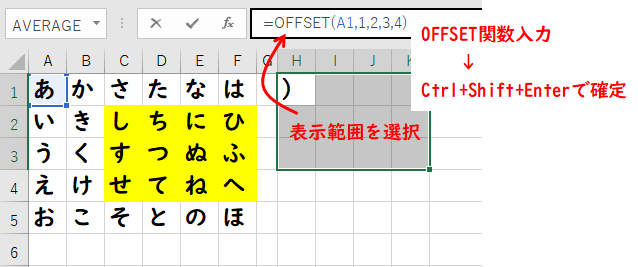 OFFSET関数は配列数式のため、エクセルのバージョンによっては入力時に表示される範囲をすべて選択してからCtrl + Shift + Enterキーで入力を確定させる必要があります。