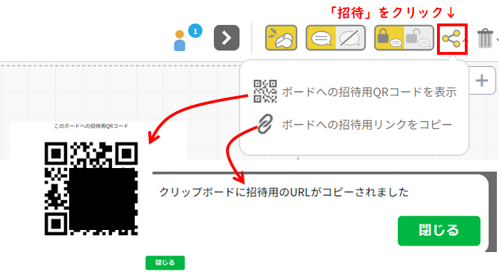 画面右上にある「招待」ボタンをクリックし、「ボードへの招待用QRコードを表示」か「ボードへの招待用リンクをコピー」のいずれかを選びます。
