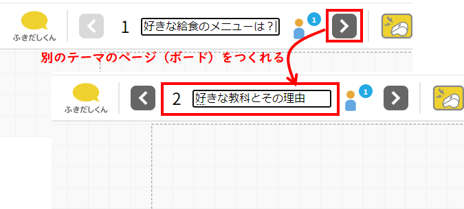 児童・生徒がボード(ページ)を移動するには、同様に画面上部の「<」「>」ボタンをクリックします。