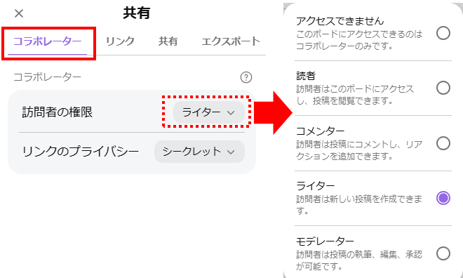 パドレットでは共有方法を「読者」「コメンター」「ライター」「モデレーター」から選択できます。