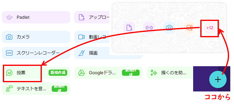 パドレットで投票機能を使うには右下の「+」ボタンをクリックし、表示されたメニューから「その他の添付ファイルタイプ」を選択し、「投票」を選びます。