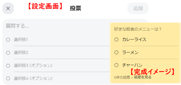 投票機能の設定画面と完成イメージは下記のようになっています。