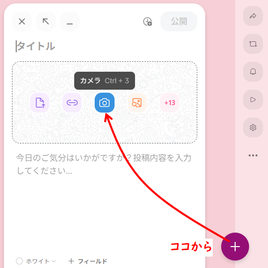 白い投稿カードが表示されます。主に以下の2か所に入力します。